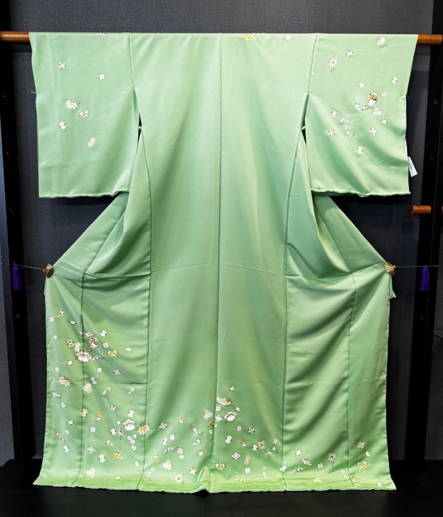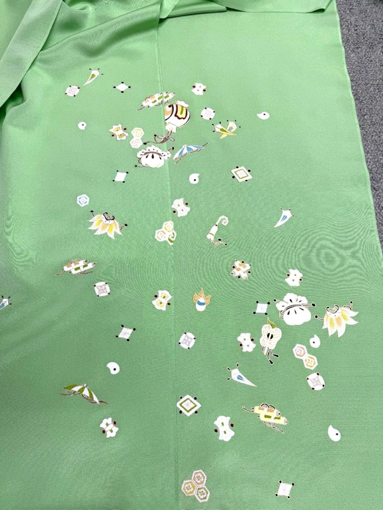宝尽くしの柄で地色は鮮やかなグリーンです。