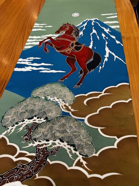 青富士に赤兎馬に松のお宮参り着物が染め上がってきました。